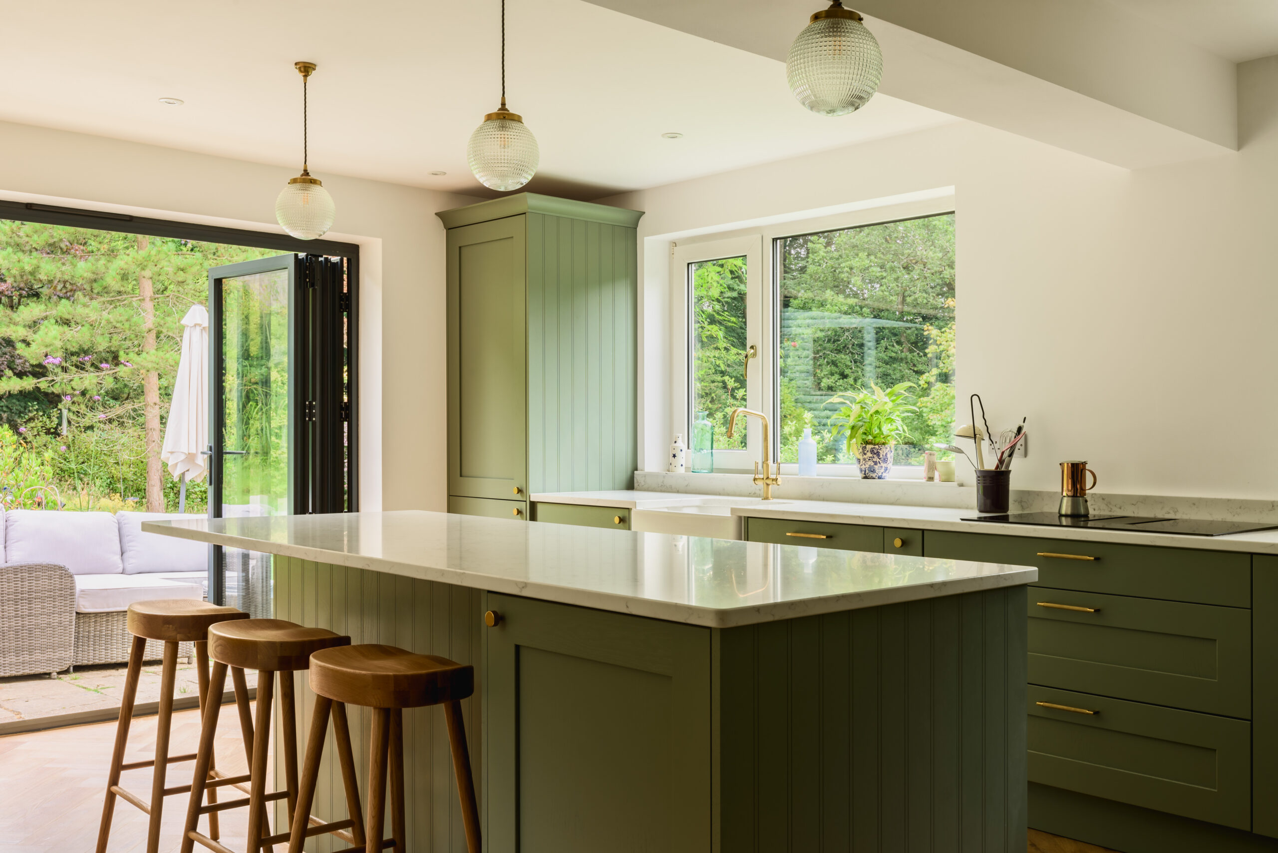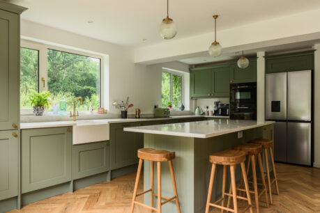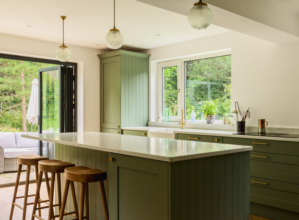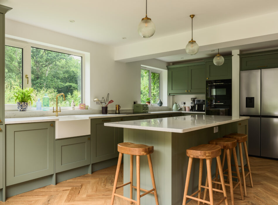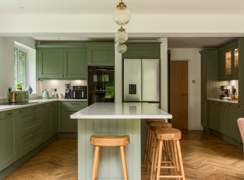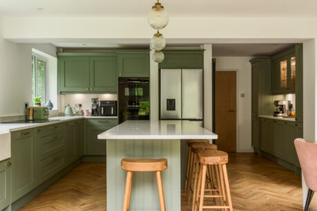 The gorgeous green hues really connect the kitchen with our clients stunning garden and have created a calm sanctuary for our clients to enjoy. The kitchen has some lovely features including T & G panelling, a traditional Belfast sink, an antique brass tap and knurled handles and a lovely dresser area with glass display units. The large central island has created the perfect place for the family to gather and enjoy their lovely new room.
