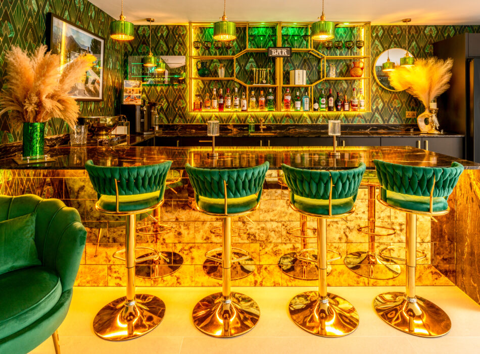 We love the indulgent décor and luxe textures- the dark black hues of the furniture, the striking Orinocco granite worktops, deep emeralds and the metallic gold accents. The overall mood is bold, seductive, and undeniably theatrical: a perfect setting for a lively night and celebrations.