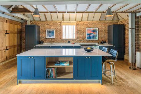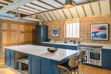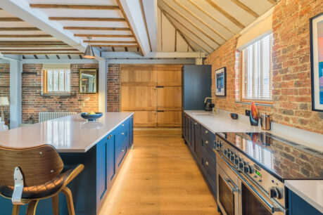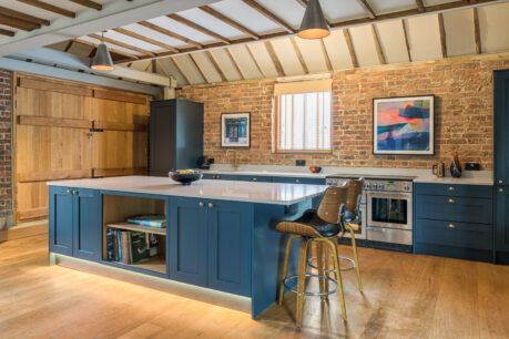 How gorgeous is this Mornington shaker kitchen we installed in West Sussex? We fell in love with this space as soon as we saw it and knew it had so much potential. It’s the perfect of fusion of old and new with traditional rustic oak beams and new industrial steels. All it needed was the addition of a beautiful new kitchen. Our clients wanted a nod to the original wooden features and the open shelving on the back of the island was the perfect nod without distracting from the overall space. PWS Strata quartz worktops in Elegant Clay gives a subtle contrast to the units and works perfectly with the steel beams in the room.
