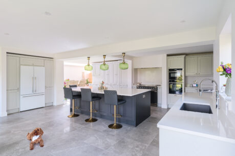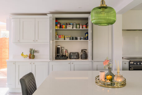 Part of a large rear extension, our clients had lived with a small galley style kitchen before starting the build and working with us on their dream kitchen. They chose the Mornington shaker door in classic Dove Grey and Graphite colours which creates the perfect balance of feeling light and calming with a touch of drama with the Graphite island and stunning bar area which links the kitchen and dining space so perfectly together. The hidden bi-fold pantry unit is the perfect place to make your morning coffee…. this is now the most fabulous space to socialise with friends, family and even gets the firm seal of approval from their gorgeous family dog!