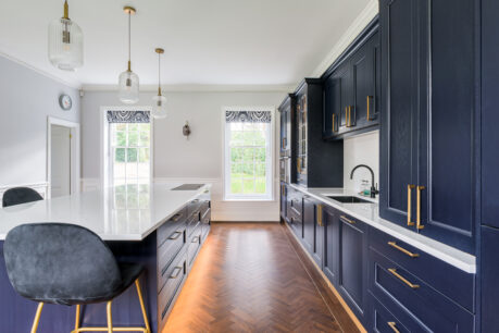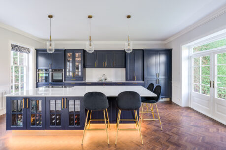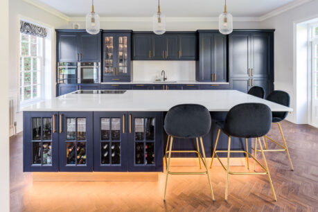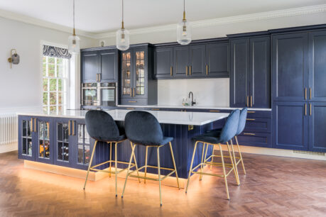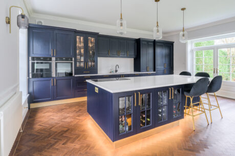 This stunning kitchen was part of a fabulous renovation of a beautiful Georgian property and our clients wanted something that would suit the character of the property but with a modern, stylish and opulent feel. We love the touches such as the brushed brass accessories including the plinth, LED lighting around the island, Georgian glass units and stunning Silestone quartz worktops in Etheral Glow…..we could look at this kitchen all day!