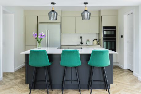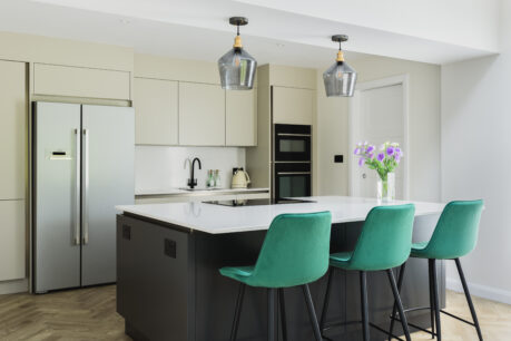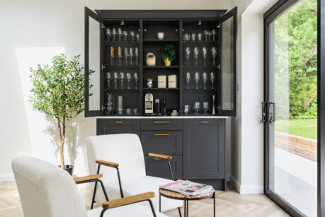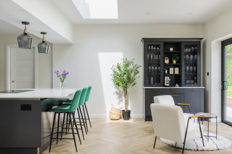 This kitchen is a great example if you want a neutral and classic base colour palette but add in a touch of drama with a darker colour. Our client also chose to team the ‘true handleless’ style of the main kitchen with the Hunton shaker door in the dresser area. This keeps the space connected but creates a different, more classic contemporary feel as well as a great opportunity to showcase glassware – we love how sophisticated this looks!