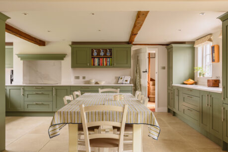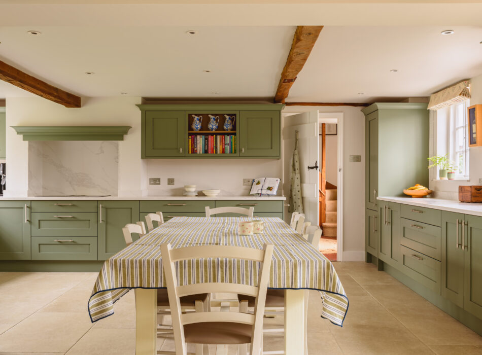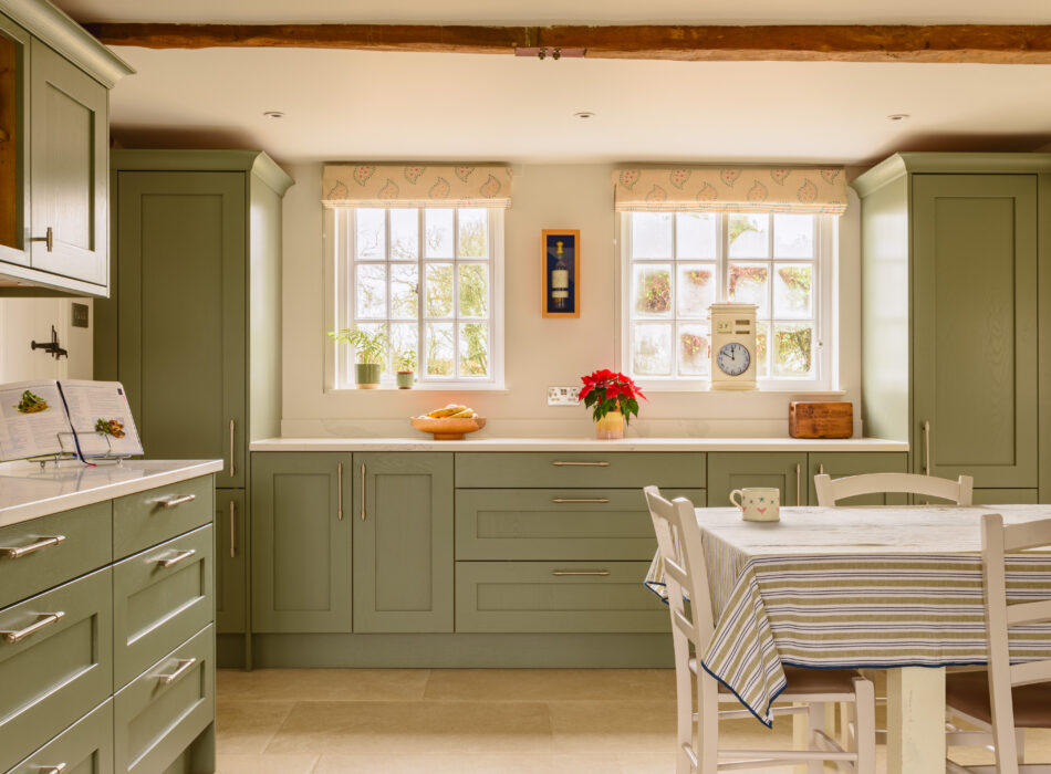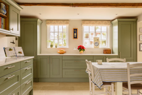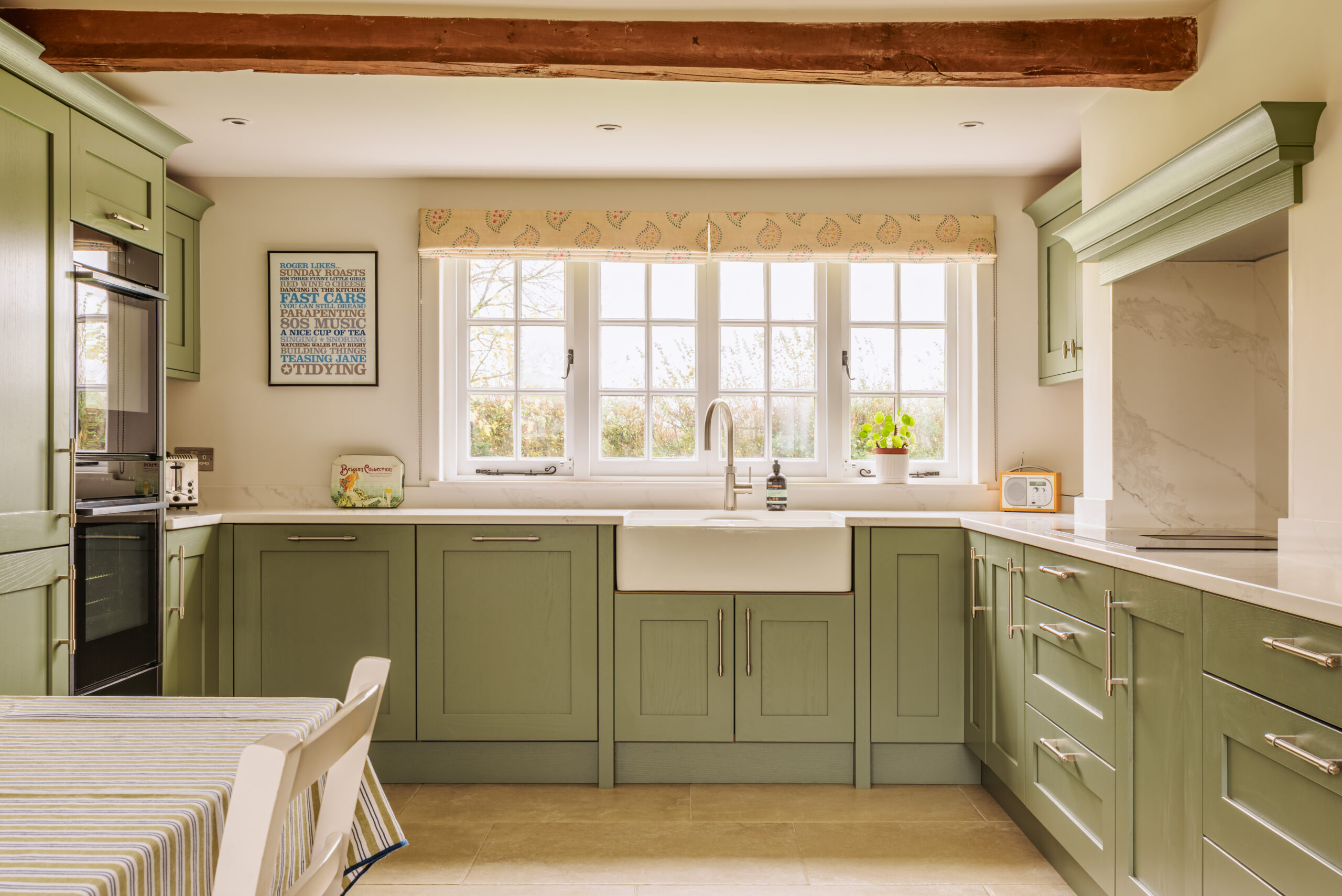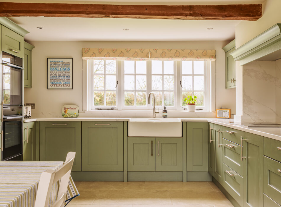 Our timeless Mornington Shaker in regiment green was the perfect choice for this country cottage. The soft regiment green hue brings warmth and character to the space, whilst complementing the cottage’s natural textures and rustic details like the gorgeous oak beams and feature mantle. The green tones connect the kitchen with our clients beautiful country garden outside, and reinforce the natural, relaxed atmosphere of country living. Whilst the kitchen has a classic look and feel, it is full with modern touches- such as Neff appliances, a vented hob and Quooker hot tap.